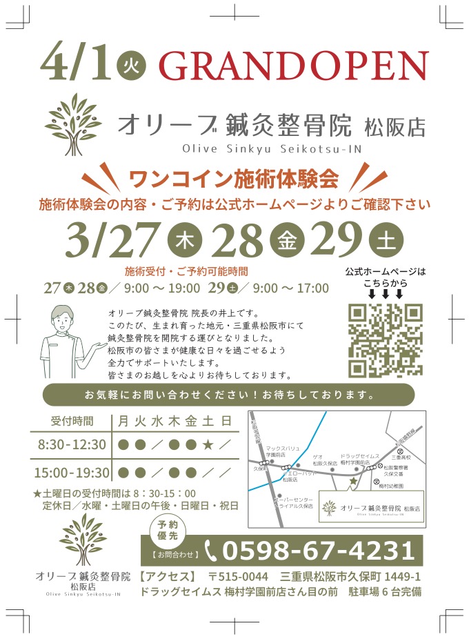 オリーブ鍼灸整骨院 あなたに合った治療が見つかる。 三重県松阪市にあるオリーブ鍼灸接骨院。豊富なメニューと熟練の技術で、あなたに合った最高の施術をご提供します。 Googleマップ 0598-67-4231 お知らせ News ワンコイン施術体験会開催のお知らせ 院長挨拶 Greeting オリーブ鍼灸整骨院 院長の井上です。このたび、生まれ育った地元・三重県松阪市にて鍼灸整骨院を開院する運びとなりました。私がこの仕事を志したのは、高校時代に打ち込んでいたバレーボールがきっかけです。ケガを通じて治療の重要性や奥深さを実感し、「人の体と向き合う仕事がしたい」と強く思うようになりました。その後、整形外科と整骨院で10年以上の経験を積み、独立を決意しました。整形外科では、さまざまなケガの治療に携わり、痛みを和らげるだけでなく、患者さまが再び元気に日常を取り戻すお手伝いをしてきました。これらの経験を活かし、オリーブ鍼灸整骨院では、痛みやケガの治療をはじめ、お体のお悩みを根本から改善できるよう尽力いたします。松阪市の皆さまが健康な日々を過ごせるよう、全力でサポートいたします。皆さまのお越しを心よりお待ちしております。 当院の特徴 Features Feature. 01 オーダーメイド治療 Feature. 02 確かな技術と経験 Feature. 03 幅広い症状への対応 Feature. 04 安心の個室完備 Feature. 05 最新機器で効果的な治療 当院の特徴 治療メニュー Services 日々の痛みや不調に寄り添う多彩な治療メニューをご用意しています。一人ひとりの状態に合わせた最適なケアで、健康な体づくりをサポートします。 治療メニュー・料金 交通事故治療 Accident 当院では交通事故治療、交通事故相談を行っております。交通事故による症状でお悩みの際はお気軽にご相談ください。 院内紹介 Our office アクセス Access 三重県松阪市久保町1449-1駐車場6台完備